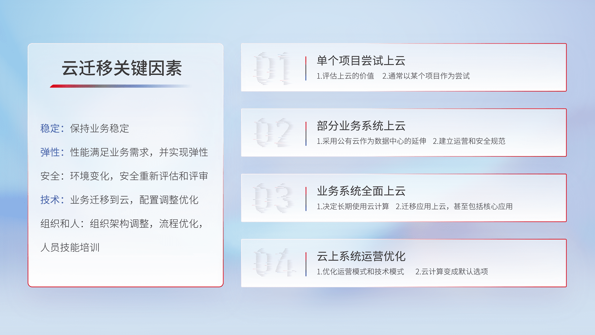 结合实际业务,,,,从规划设计、、、、云平台选型、、、、云原生改造、、数据迁移、、、、集成交付,,,迁移全过程为客户识别最佳上云路径,,做好风险识别管理,,,设计网络架构、、、身份权限、、安全审计合规、、、操作审计、、、、日志审计、、监控告警策略、、多站点容灾设计等,,,对云上基础设施进行整体规划,,提升IT治理水平,,以满足弹性、、、高可用、、、高性能的需求。。。