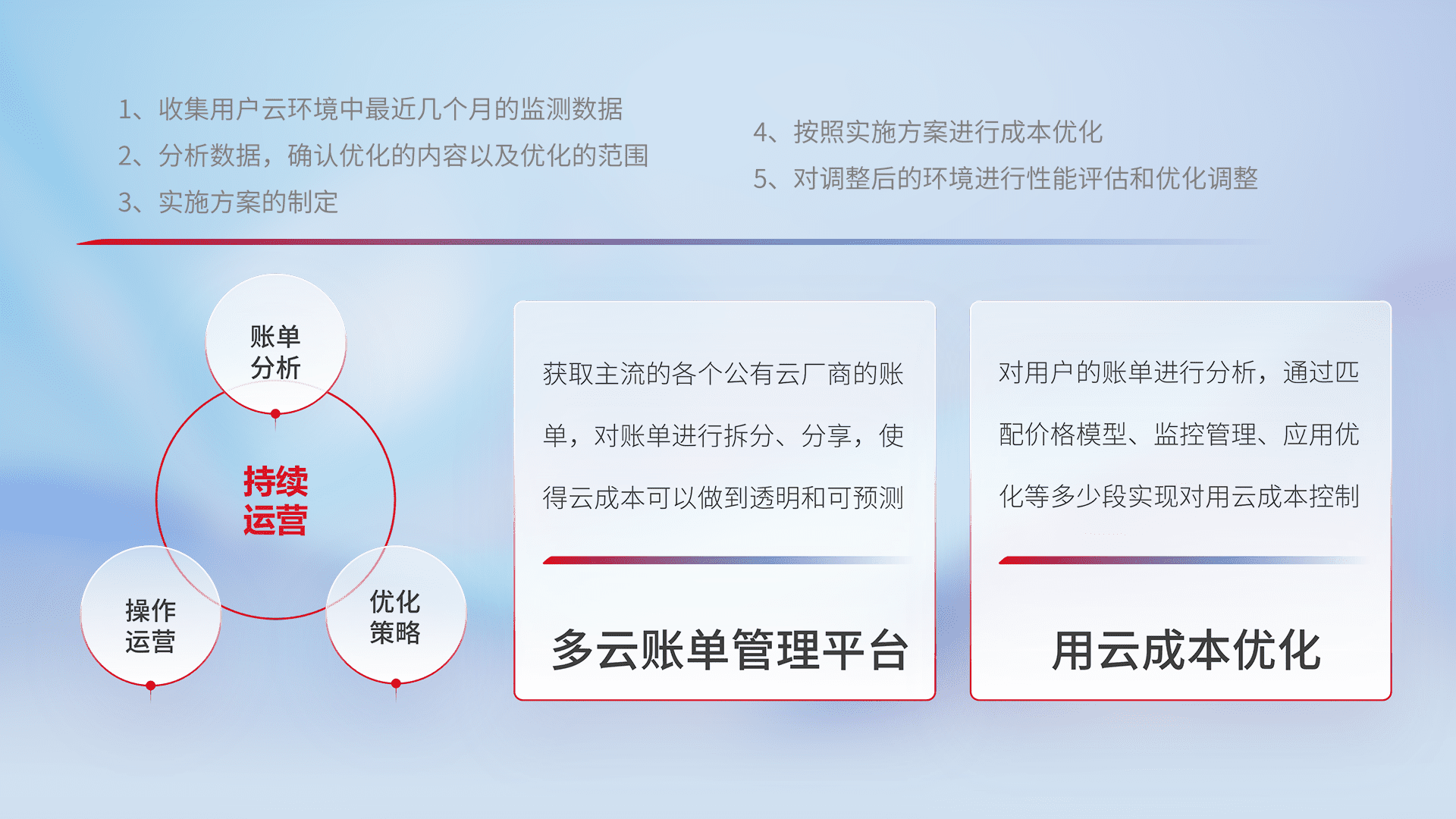 通过多云纳管,,,,以统一的资源数据模型把客户的云资源进行抽象和封装,,进而实现对多云资源的统一操作,,,保障云资源管理的可靠性、、、、稳定性与可用性。。量身定制化运维内容,,,,配置、、开发运维、、、补丁管理、、备份、、监控、、、、认证和访问管理、、、、审计和日常巡检等,,,,保障在用云过程中的可靠度,,稳定度以及高可用率。。。。